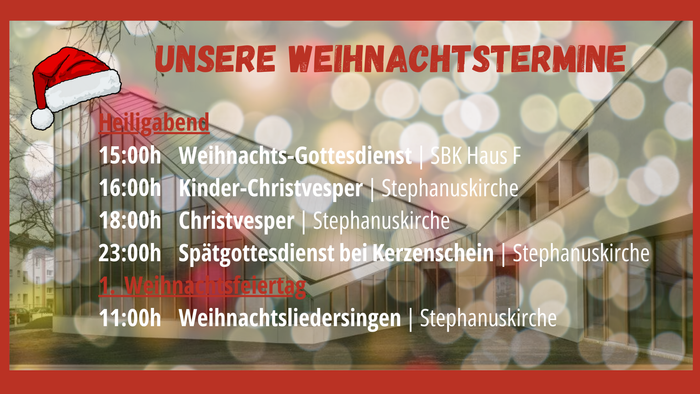 Schon zwei Adventsgottesdienste liegen hinter uns und auch zwei der drei Termine unseres Singens im Advent, am Weihnachtsbaum in bzw. vor der Stephanuskirche, liegen hinter uns, Zeit also, die diesjährigen Weihnachtstermine zu kommunizieren.