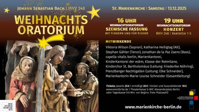 Viktoria Wilson (Sopran), Katharina Heiligtag (Alt), Stephan Gähler (Tenor), Jonathan de la Paz Zaens (Bass), MarienKantorei, KinderKantorei der esbm, Prenzlberger Nachtigallen (Leitung: Elke Schneider), Marienkantorin Marie-Louise Schneider (Gesamtle