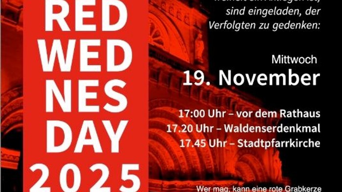 Red Wednesday 2025 - Steyr Christ*innen aus allen Konfessionen und alle, denen Religionsfreiheit ein Anliegen ist, sind eingeladen, der Verfolgten zu gedenken: 19. November 17:00 Uhr - Beginn vor dem Rathaus 17:20 Uhr - Waldenserdenkmal 17:4...
